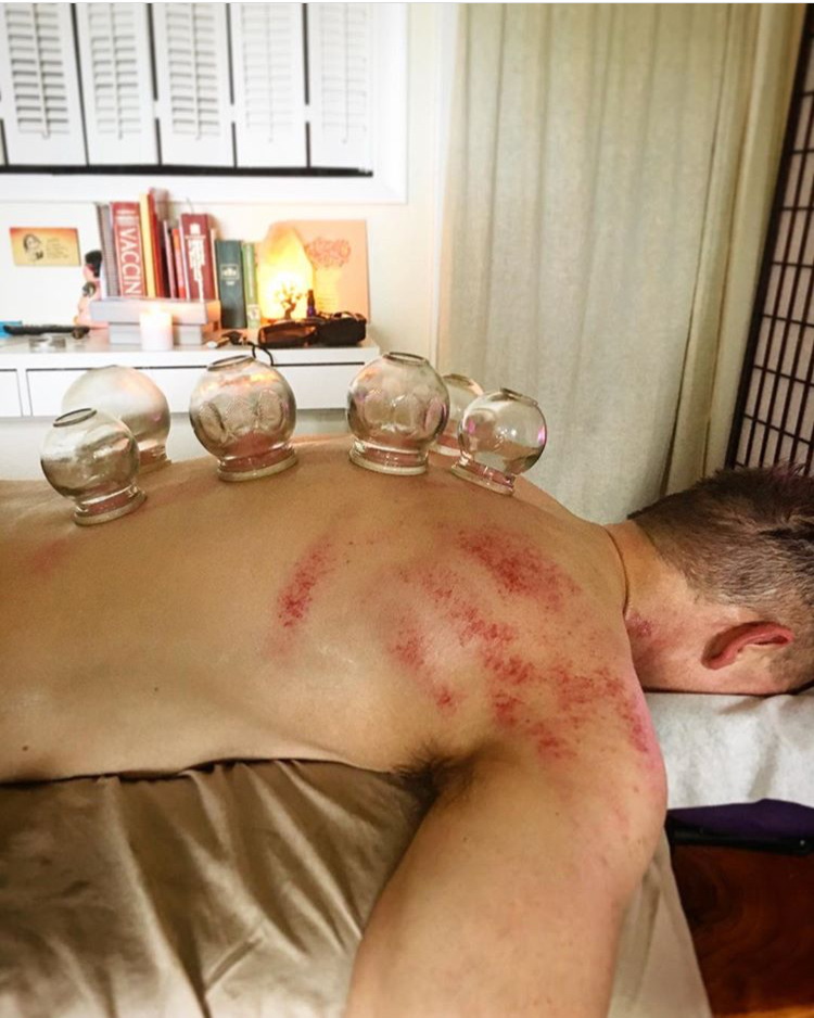 These marks are from cupping and guasha. Inflammation is the muscles is relieved as it is dredged out toward the surface. The marks go away, and symptoms of pain and anxiety often follow.