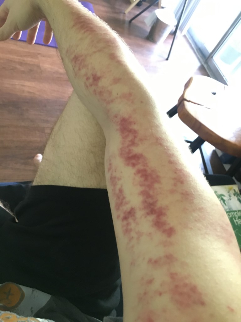 Marks from Guasha. You can see the inflammation follows the trajectory of the Large-Intestine Yangming Meridian, Sanjiao-Shaoyang meridian, and the Lung-Taiyin meridian.