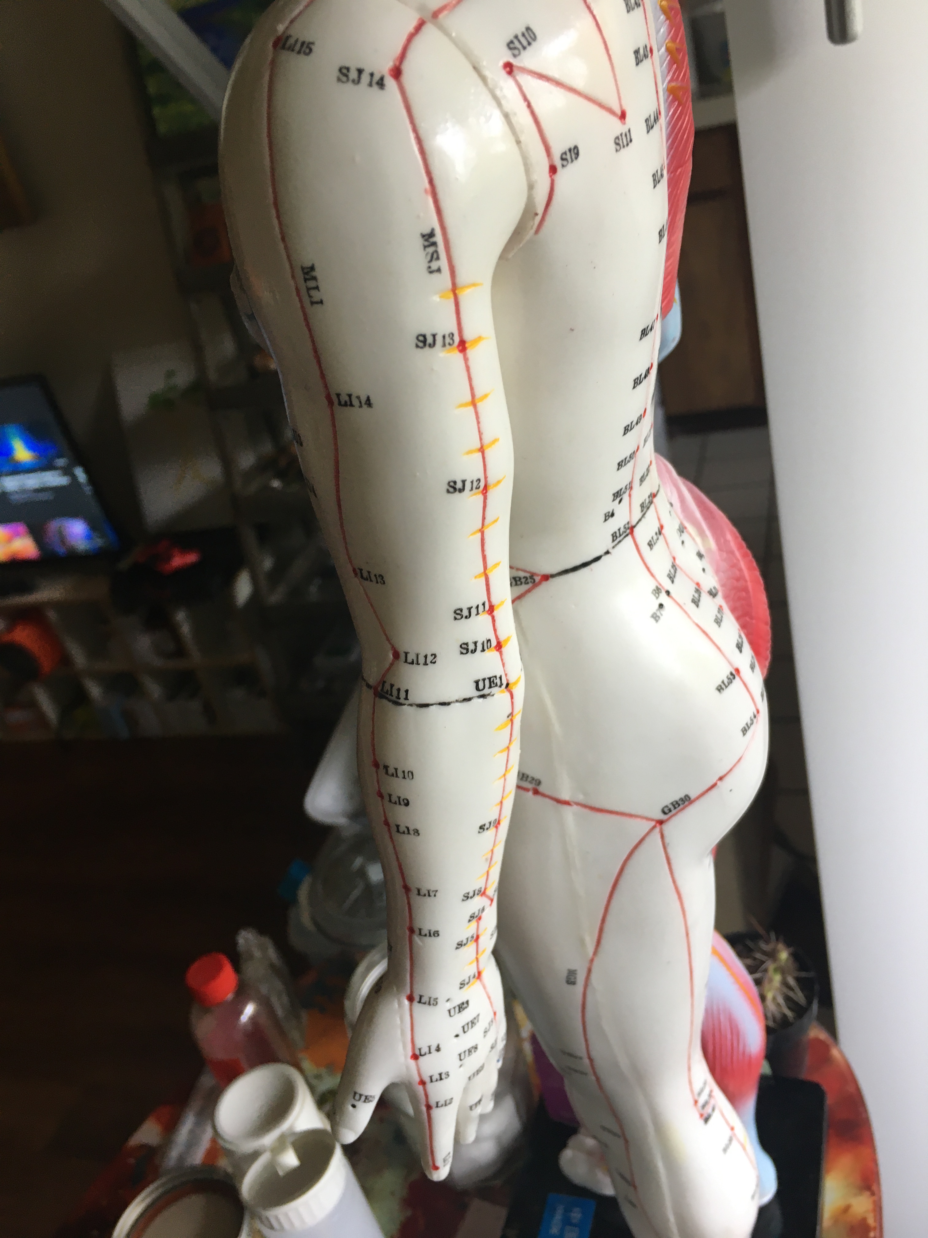 Distal pain often follow the trajectories of the meridians, rather than simply corresponding to the individual muscles. So, even though your tear is in your Supraspinatus or your Teres Minor, you might develop pain at your wrist, or your elbow, and not at the expected point of trauma. If you examine the photos of the anatomy model pictured above, you might see lines that parallel your own pain patterns.
